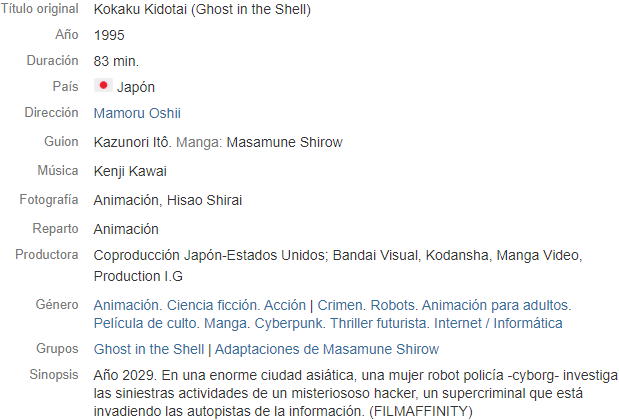Ghost in the Shell es una película de anime japonesa de 1995 dirigida por Mamoru Oshii y producida por Production I.G, Bandai Visual, Kdansha y Manga Entertainment, basada en el manga homónimo de Masamune Shirow. Fue estrenada en Japón el 18 de noviembre de 1995, convirtiéndose en uno de los productos cinematográficos ciberpunk más representativos y originales del género.